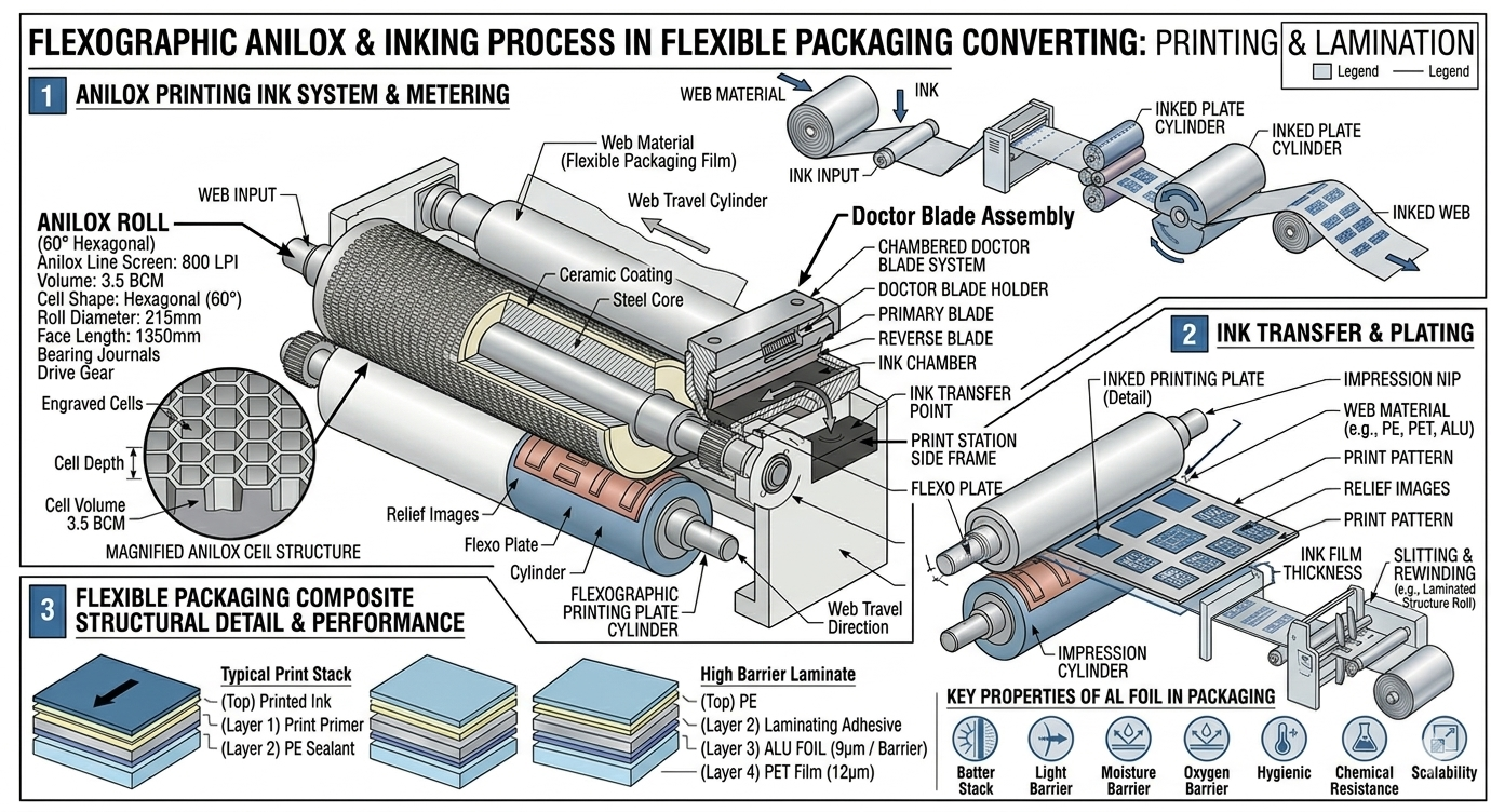 An engraved ceramic or chrome roll that meters ink to the flexo plate via cell volume and line screen.