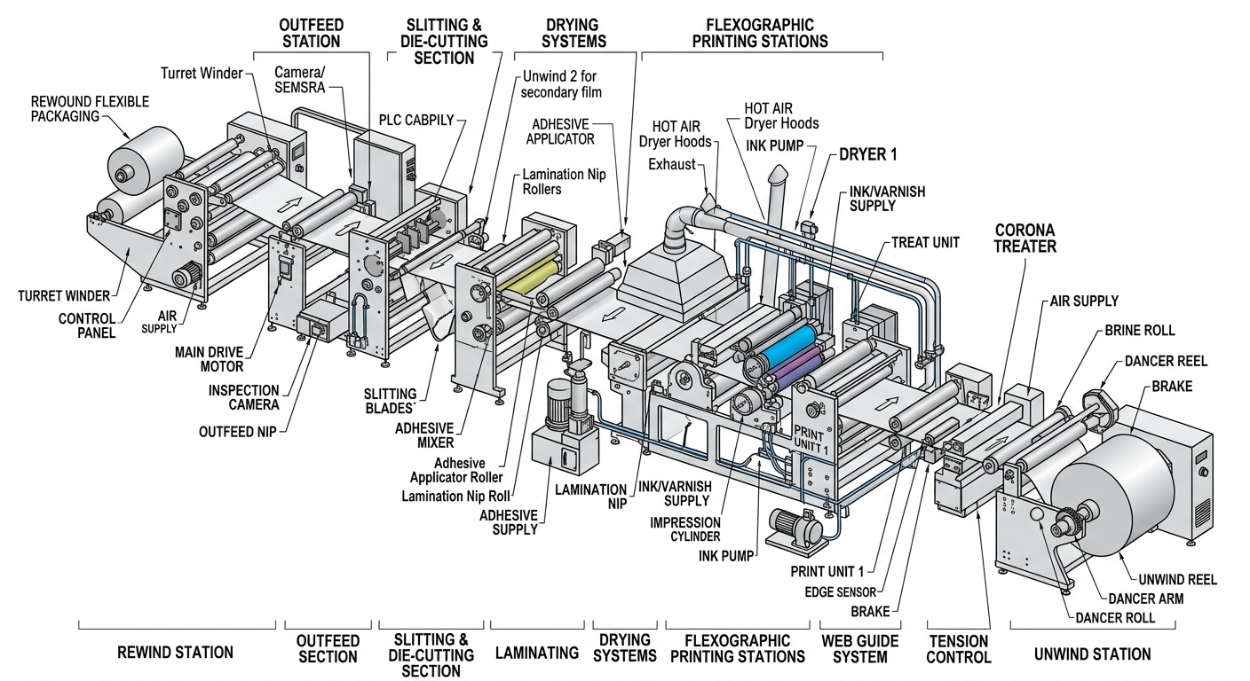 - Packaging Industry: flexible films are laminated, printed, slit, and rewound into roll stock that can be used on automated packaging lines such as form-fill-seal machines.