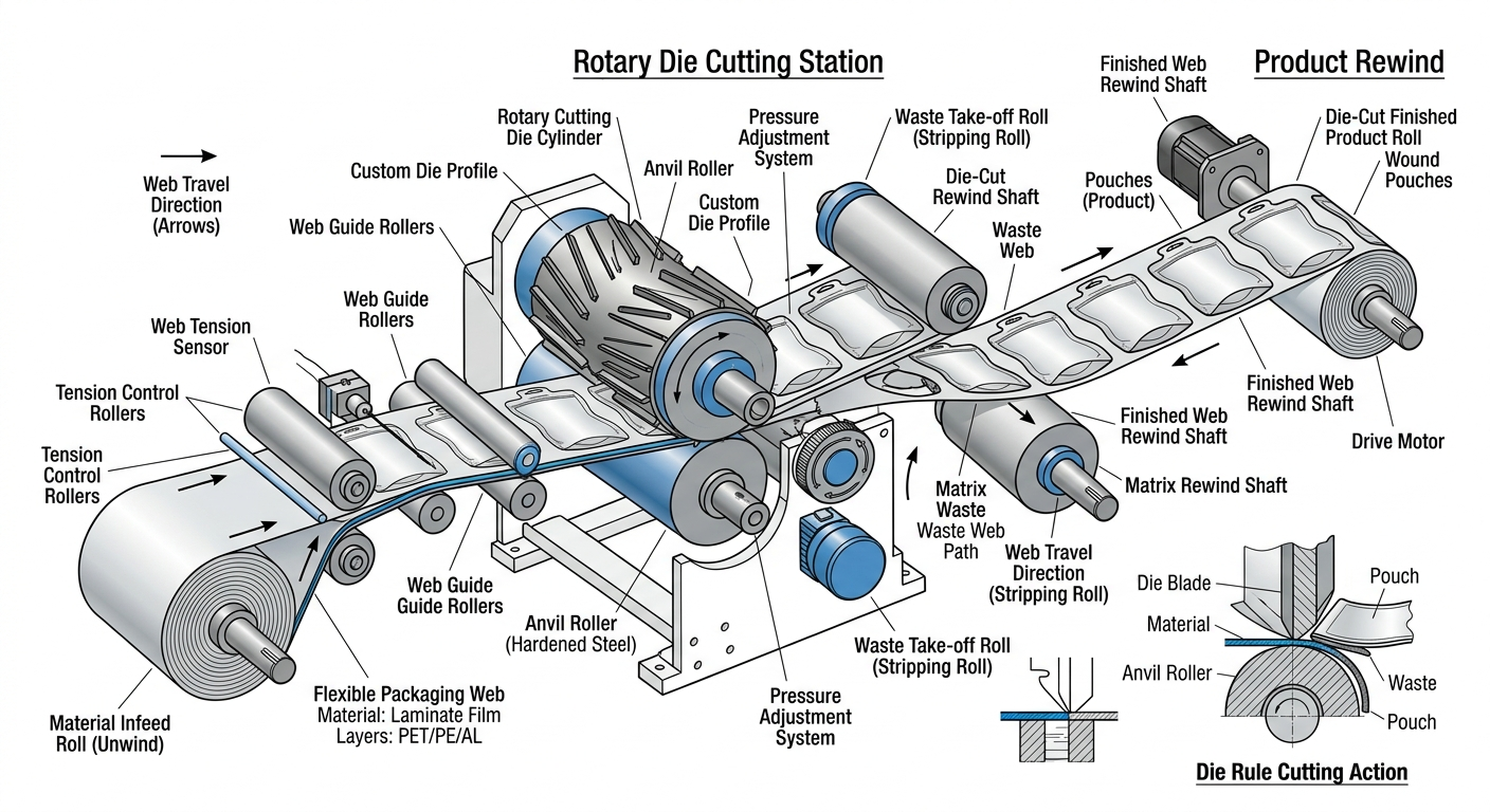 Die cutting is a converting process that uses a shaped metal die or blade to cut flexible materials into precise shapes, components, or finished parts. This process is commonly used in roll-to-roll manufacturing to produce high-volume parts with consistent accuracy.