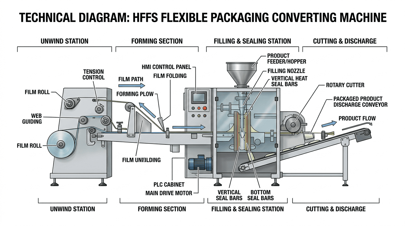 Horizontal form-fill-seal where the package is formed and filled in a horizontal orientation—often for products requiring gentle handling or trays.